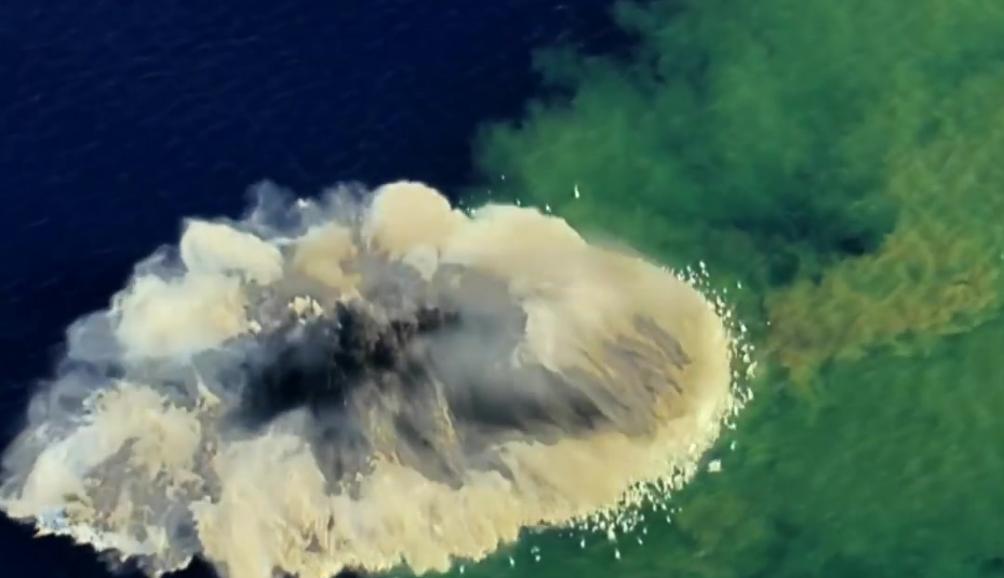 海底火山喷发集萃海底火山喷发时,在水较浅、水压力不大的情况下,常有壮观的爆炸,这种爆炸性的海底火山爆发时,产生大量的气体,主要是来自地球深部的水蒸气、二氧化碳及一些挥发性物质,还有大量火山碎屑物质及炽热的熔岩喷出,在空中冷凝为火山灰、火山弹、火山碎屑。