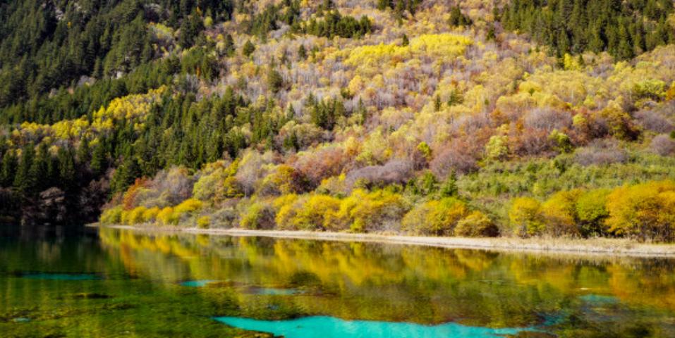 此时的九寨沟五颜六色,大部分的树叶都已经完全变色,有的是金灿灿的黄,有的是满山遍野的红,再加上其他的颜色作为过度和点缀,此时的九寨沟俨然成为一个上帝的调色盘。