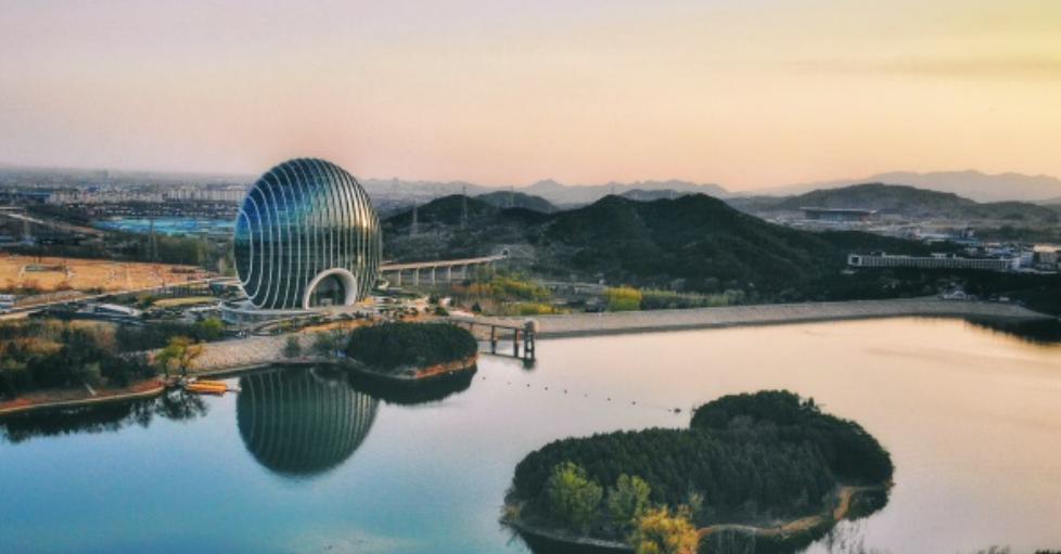 雁栖湖距离北京市中心车程约70公里,湖水清澈蔚蓝,周围小山环抱,风景优美。