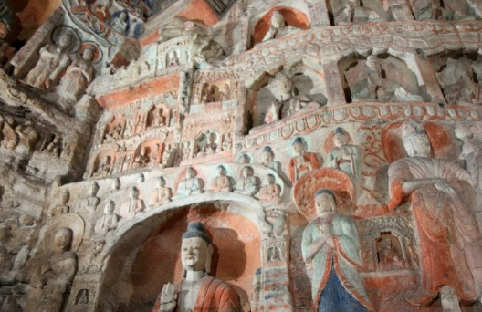 云冈石窟的造像气势宏伟,内容丰富多彩,堪称公元5世纪中国石刻艺术之冠,被誉为中国古代雕刻艺术的宝库。按照开凿的时间可分为早、中、晚三期,不同时期的石窟造像风格也各有特色。早期的“昙曜五窟”气势磅礴,具有浑厚、纯朴的西域情调。中期石窟则以精雕细琢,装饰华丽著称于世,显示出复杂多变、富丽堂皇的北魏时期艺术风格。晚期窟室规模虽小,但人物形象清瘦俊美,比例适中,是中国北方石窟艺术的榜样和“瘦骨清像”的源起。此外,石窟中留下的乐舞和百戏杂技雕刻,也是当时佛教思想流行的体现和北魏社会生活的反映。
