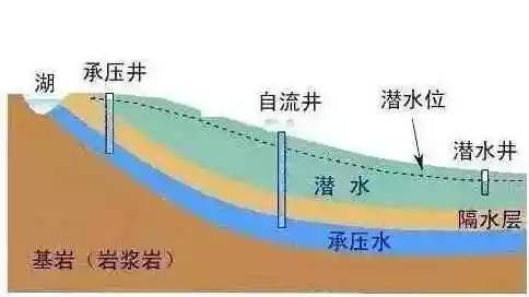 潜水受重力影响,具有一个自由水面(即随潜水量的多少上下浮动),一般由高处向低处渗流。承压水受隔水顶板的限制,承受静水压力,有一个受隔水层顶板限制的承压水面和一个高于隔水层顶板的承压水位(即补给区和排泄区水位的连线)。承压水是由静水压力大的地方流向静水压力小的地方。
