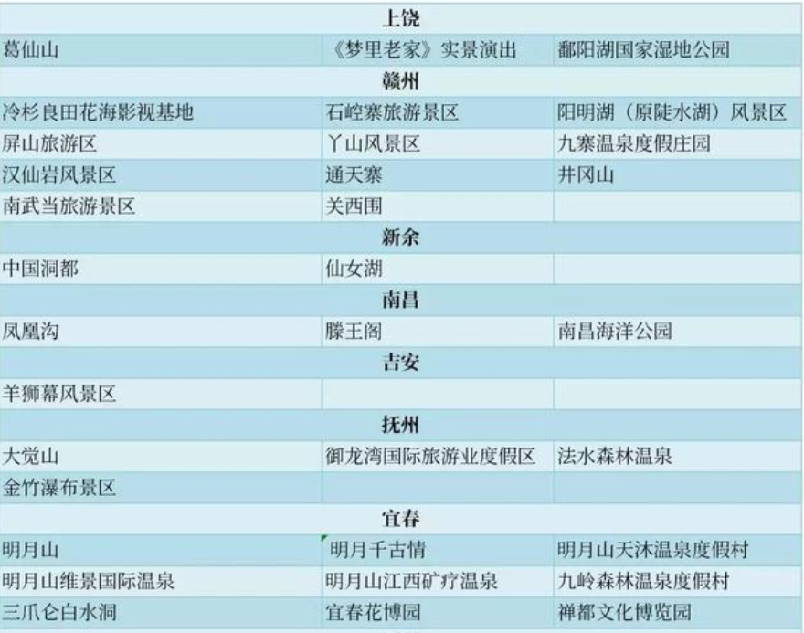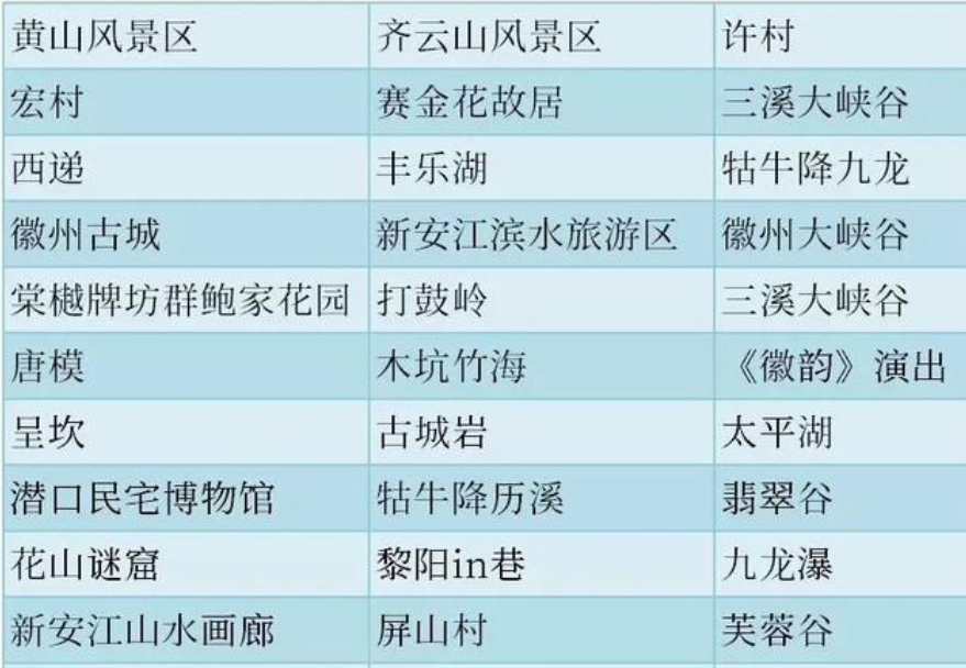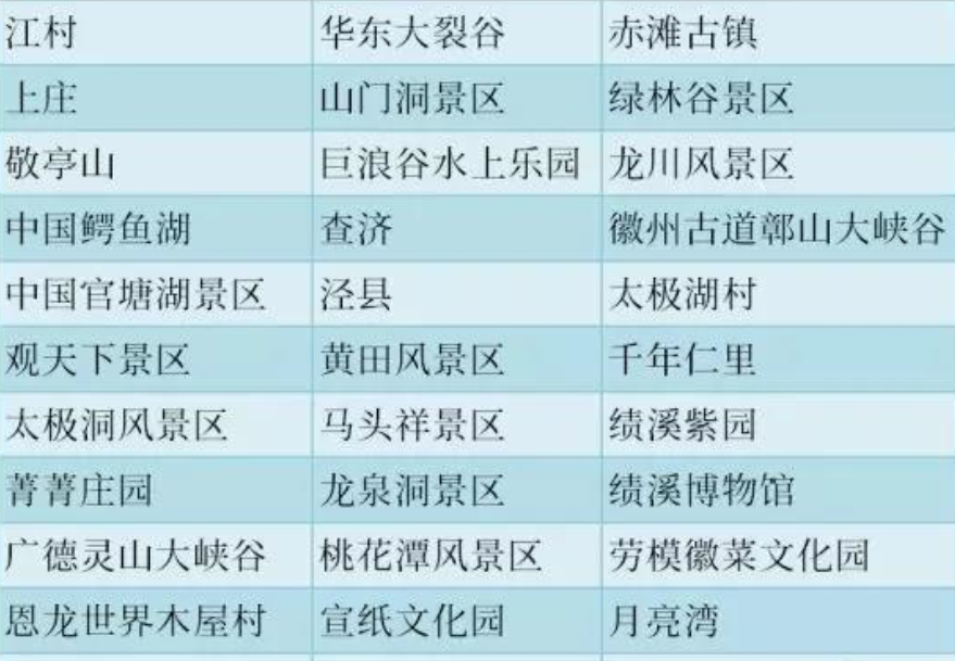 合肥:合肥海洋世界、深业半汤御泉庄、姥山岛芜湖:马仁奇峰、大浦乡村世界、丫山花海石林、芜湖六郎湿地花海六安:天堂寨、燕子河大峡谷、梅山水库风景区、万佛湖、海泉湾汤王温泉淮南:八公山国家森林公园阜阳:八里河、迪沟、临泉魔幻动物园马鞍山:启迪乔波滑雪场、采石矶、德化堂中国古床博物馆、大青山野生动物世界、诗城人家、褒禅山、太湖山、凌家滩、霸王祠、林海生态园、香泉温泉滁州:狼巷迷谷、韭山洞、明皇陵、明中都鼓楼、琅琊山景区、白鹭岛国际度假村、景华生态园、金甲溪千岩峡森林漂流、皇甫山、八岭湖生态旅游区、池杉湖国家湿地公园(需网上预约)、来安兴茂国际旅游度假区、长城梦世界影视城。毫州:曹操运兵道、华祖庵、花戏楼、南京巷钱庄、魏武祠、陈抟庙景区、曹腾墓、张园汉墓、道德中宫、天静宫、亳州城市展览馆、古井酒文化博览园