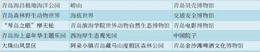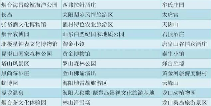 烟台海昌鲸鲨海洋公园、长岛、张裕酒文化博物馆、烟台农博园、北极星钟表文化博物馆、昆嵛山国家森林公园、塔山风景区、黑尚莓酒庄、蛇博园、崑龙温泉、烟台茶文化体验园、张裕国际葡萄