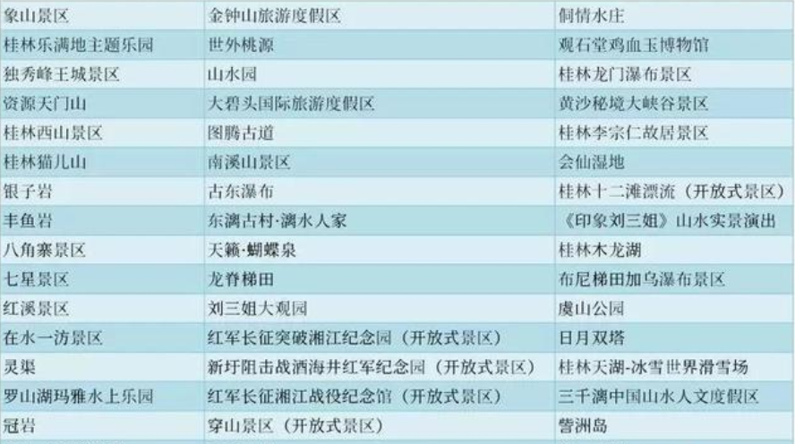 贺州:姑婆山国家森林公园、黄姚古镇、十八水原生态景区、玉石林、神仙湖景区、神剑石林景区、南山茶海景区、钟山百里水墨画廊景区、大桂山国家森林公园、客家围屋景区、贺州园博园、黄姚诗画姚江景区、紫云洞景区