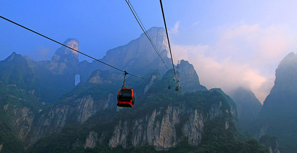 索道以张家界市中心的城市花园为起点,直达天门山顶的原始空中花园,犹如一道彩虹飞渡“人间” “天上”,又象一条巨龙腾翔素云苍穹,依山籍壁,拔地冲天,恢宏壮观,成为天门山旅游风景区“四大奇观”之一,为张家界这一世界级风景名胜区又添绝世奇景。