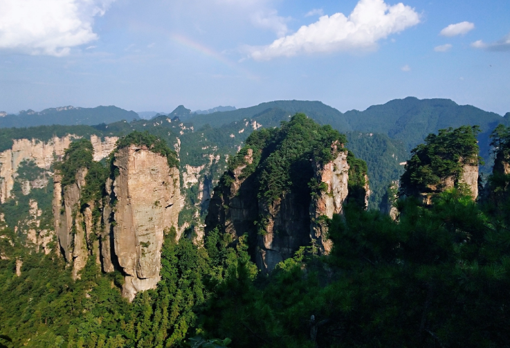 一、天子山天子山位于“金三角”的最高处,素有“扩大的盆景,缩小的仙境”的美誉。天子山海拔最高1262.5米(昆仑峰),最低534米(狮兰峪)。景区总面积67平方公里,环山游览线有45公里。天子山风光,用一名话来概括,就是“原始风光自然美”。她的景观、景点都是天造地设,全无人工雕琢痕迹。