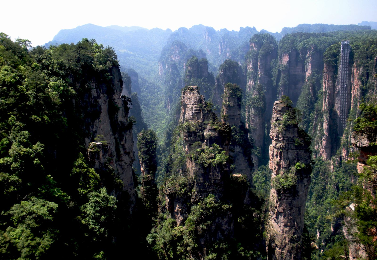 百龙天梯气势恢弘,垂直高差335米,运行高度326米,由154米的山体内竖井和172米的贴山钢结构井架组成,采用三台双层全暴露观光并列分体运行。以“最高户外电梯”荣誉而被载入吉尼斯世界纪录™,是自然美景和人造奇观的完美结合。百龙天梯的建成实现“山上游,山下住”的目标,将袁家界、金鞭溪、天下第一桥、迷魂台等绝世美景从幕后推向了前台,解决了多年困扰景区的交通瓶颈问题,实践证明建设百龙天梯是非常重要的。