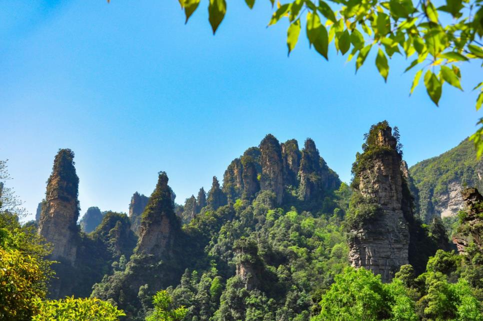 袁家界袁家界景区是一个山地高台,这里树木茂盛,有雾气弥漫、群峰叠嶂的美景。的景点是电影《阿凡达》中的悬浮山“哈利路亚山”的取景地——乾坤柱。袁家界景区游览完毕后,可以乘坐景区免费环保车前往北部的天子山景区游玩。也可以当天在袁家界住宿,景区内有不少农家。