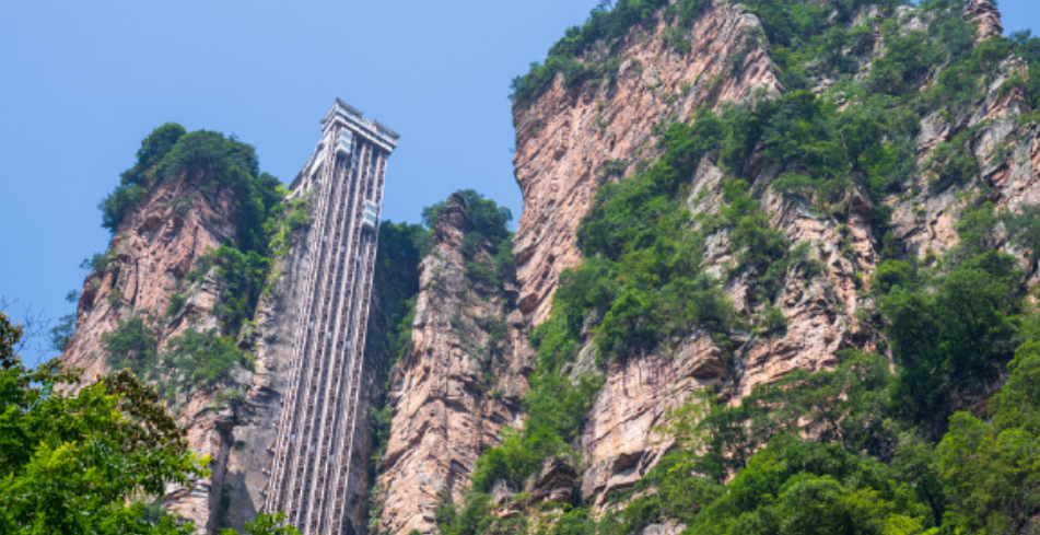 百龙天梯1999年9月动工,2002年4月投入营运,电梯的主要设备由德国知名电梯公司研究生产,耗资人民币1.8亿元,被誉为“世界上最高、运行速度最快、载重量最大的电梯”,也因此被载入吉尼斯世界纪录。