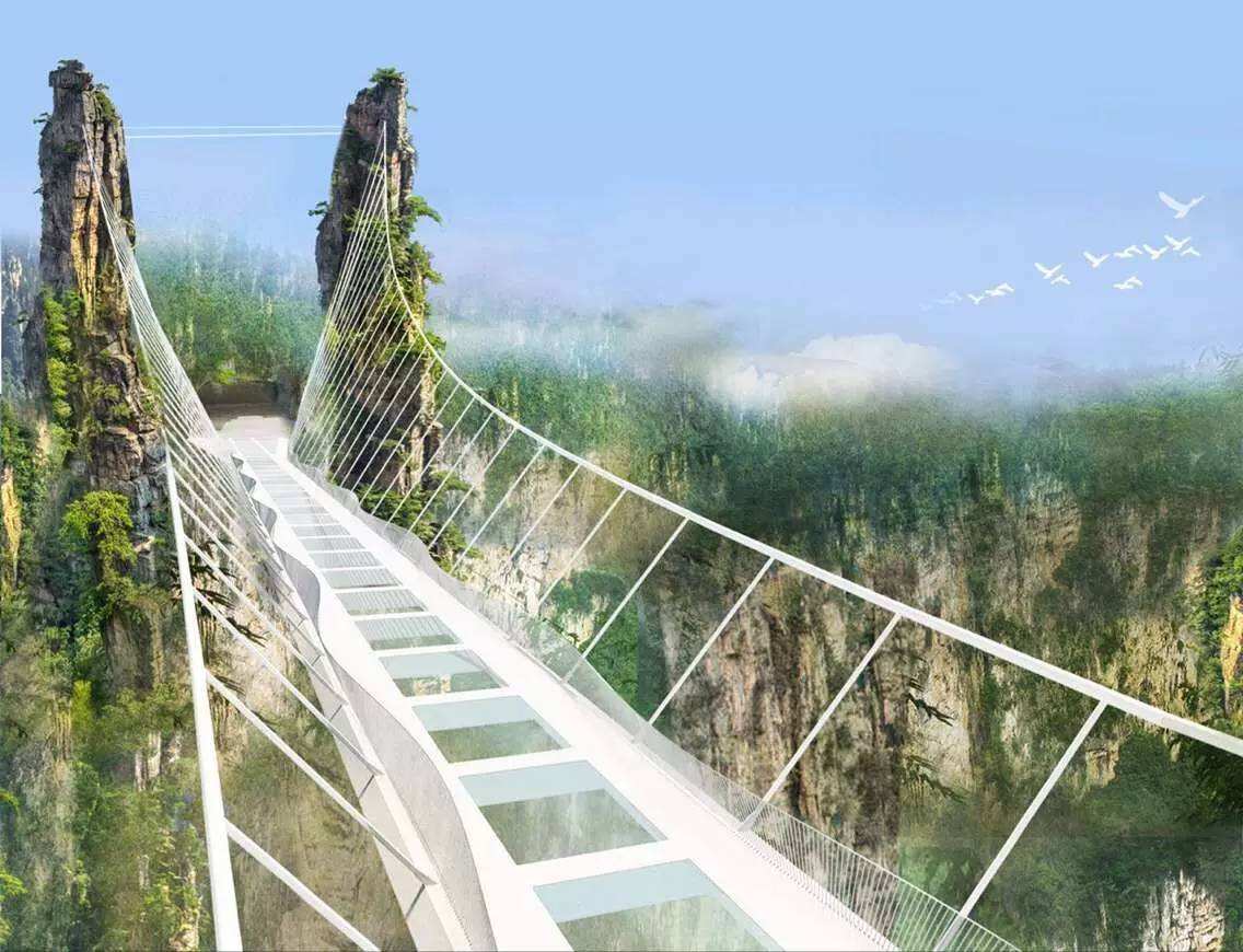 这座玻璃桥是世界最高、跨度最长的玻璃桥,大桥建在大峡谷两侧的峰顶上,横跨大峡谷,桥拱距谷底相对高度约400米,全长约370米,桥面全部采用透明玻璃铺设,桥中心有全球最高的蹦极(暂未开放)。站在桥上,脚下400米处的谷底全景尽收眼底。玻璃主桥建成后将申报吉尼斯世界纪录。
