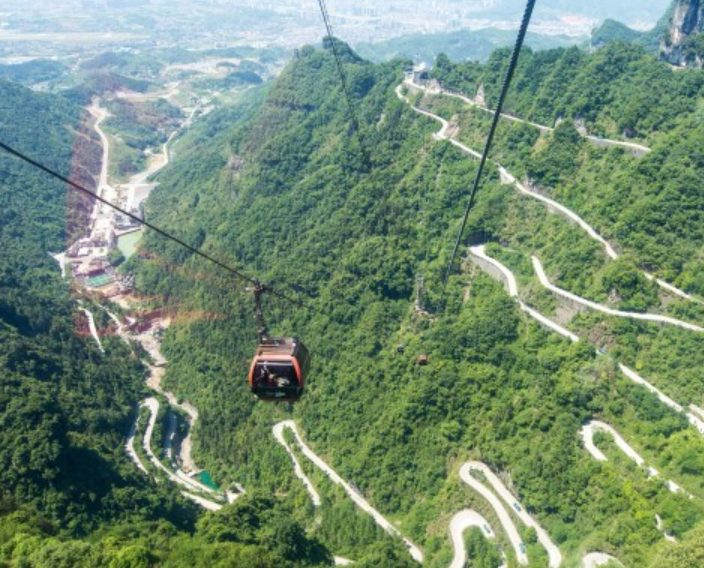 张家界天门山索道是世界最长的高山客运索道,索道以张家界市中心的城市花园为起点,直达天门山顶的原始空中花园,犹如一道彩虹飞渡“人间” “天上”,又象一条巨龙腾翔素云苍穹,依山籍壁,拔地冲天,恢宏壮观,成为天门山旅游风景区“四大奇观”之一,为张家界这一世界级风景名胜区又添绝世奇景。