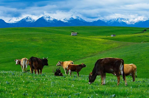 喀拉峻草原位于伊犁特克斯县的县城东南侧,距离县城的车程约30公里,是新疆最著名的草原之一。喀拉峻草原呈连绵的丘陵状,背靠巍峨雪山,草原上还有树林、花海等景观,景色辽阔秀美,是观光摄影的绝佳胜地。