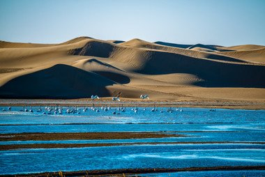 白沙湖,位于一八五团东北部的三连境内,距离团部25千米,西北距中哈边境2千米,有公路相通,内有专车往返相送。白沙湖位于沙漠之中,海拔650米,南北长约2100米,东西宽1300米,被称为“沙漠奇景”,水面约10公顷。无论春秋冬夏,湖水始终不增不减,不凝不浊,此水来自何处,又为何能常年保持常态?这是缠绕在人们心中的一个疑问,至今没有一个明确的答案,但这也正是白沙湖充分魅力的一个重要原因。