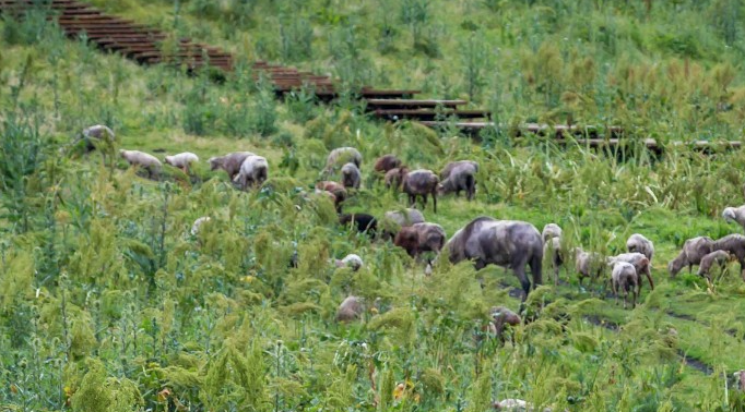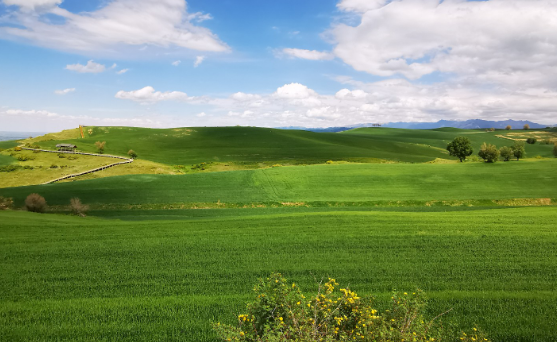 江布拉克草原自然景观与麦田交错分布,春季时百花争奇斗艳,秋季麦田转黄将大地染成一片金色;游客行走在木栈道上,眼前的景色拼接成绝美画卷。