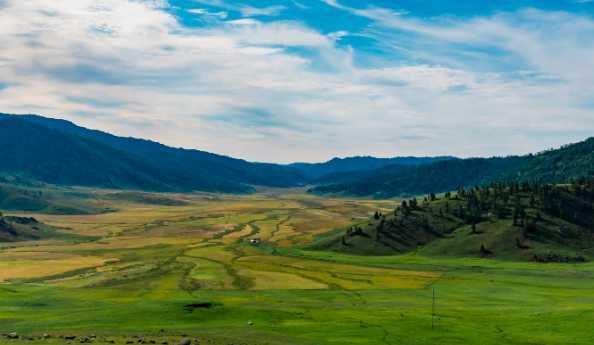 库尔德宁草原是在一条南北走向的山间阔谷;景区内青山环绕,溪水蜿蜒,山呈翠色,草如绿茵;游客远眺雪山,近览林海,其景色之美不可言状。