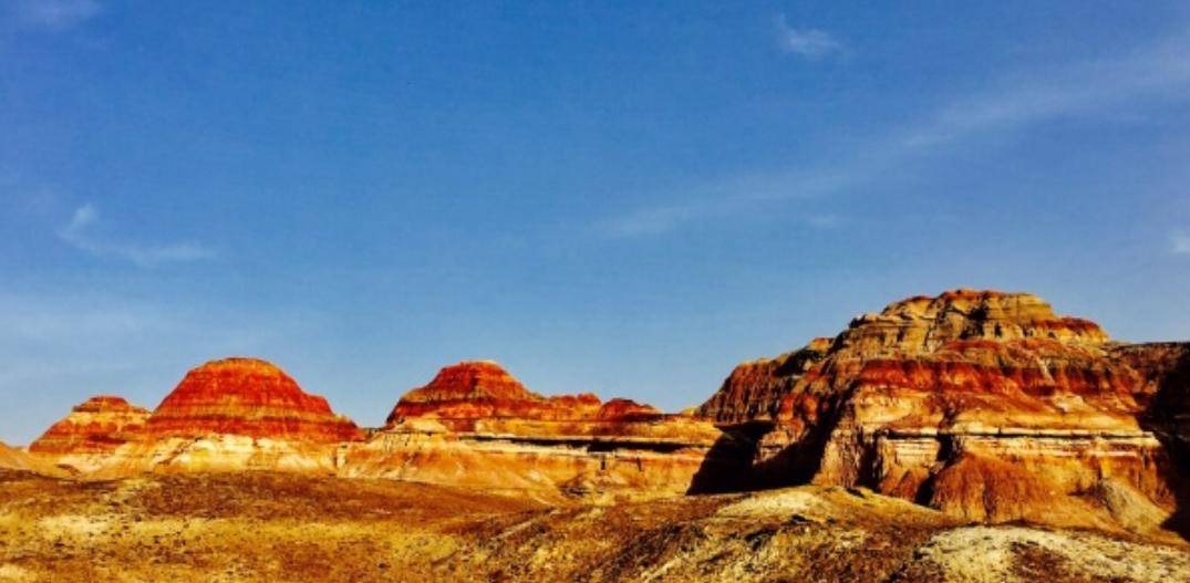 五彩城位于新疆古尔班通古特沙漠东部的吉木萨尔境内,典型的雅丹地貌。裸露于沙漠戈壁中的原始地貌,让人无法形容它的美丽和魅力。早在侏罗纪时代,这里沉积着很厚的煤层,历经风蚀雨剥,煤层表面的沙石被冲蚀殆尽,又经曝晒或雷击起火,煤层燃尽后,烧结岩堆积,加之各地质时期矿物质含量不同,这一带连绵的山丘便呈现赭红为主夹杂着黄白黑绿等多种色彩,再经风吹日晒雨剥,又呈“雅丹地貌“,远望近观,状如城廓,五彩城由此得名。
