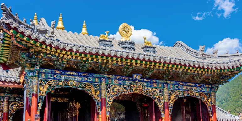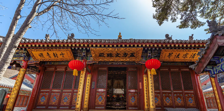 菩萨顶,又称“大文殊院”,金碧辉煌,是五台山最大的喇嘛寺院,位于显通寺后的灵鹫峰上。传说为文殊菩萨居住之处,又名文殊寺,也称真容院。位于显通寺后的灵鹫峰上,传说为文殊菩萨居住之处,又名文殊寺,也称真容院。其大雄宝殿顶上是皇家建筑专用的黄琉璃瓦,殿内供释迦牟、弥陀、药师佛。院内的文殊殿是朝山信徒必拜之处。寺前一百零八级石阶,向上迎面是一座木牌坊,上书“灵峰胜景”四个大字。佛家认为,人有一百零八烦恼,解脱烦恼之道称为“法门”。寺前的每一级台阶就象征着一个“法门”,踏上一级台阶,就意味着解脱一种烦恼,石阶尽处就是超凡脱俗的佛土。
