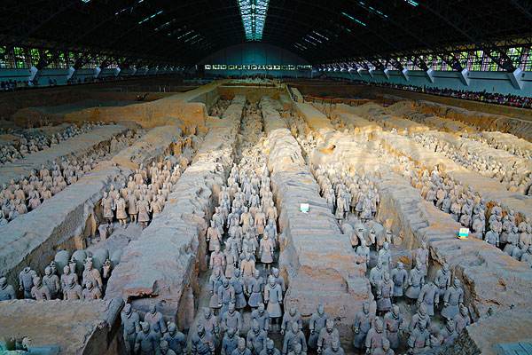 秦兵马俑是秦始皇陵的一部分,位于秦始皇陵东侧1500米处,也是世界考古史上最伟大的发现之一。秦始皇兵马俑陪葬坑是世界最大的地下博物馆,整个陪葬坑坐西向东,三坑呈品字形排列。俑坑布局合理,结构奇特,在深5米左右的坑底,每隔3米架起一道东西向的承重墙,兵马俑排列在过洞中。主要有一~四号坑还有秦俑彩绘。