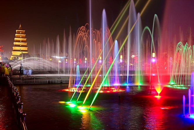 。每级水池有7级迭水,与大雁塔7层相印合。这套喷泉共设计独立水型22种,其变频方阵(排山倒海水型)、莲花朵朵、百米变频跑泉、云海茫茫、海鸥展翅、蝶恋花、水火雾以及60米高喷水柱等,都是我国最新推出的科技含量较高的新颖水型;60米宽、20余米高的大型激光水幕中4台喷泉从水里喷出,在6米高空充分燃烧低温爆开,更增加了整个喷泉的夺人气魄。音乐系统采用西安三信音响公司提供的高保真远射程专业音响系统,使喷泉声、光、水、色有机交融。