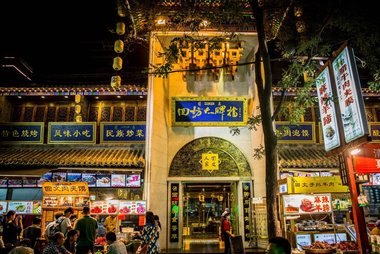 晚上的回民街有着与白天不同的精彩,整条街被浓厚的市井气息笼罩,道路两旁遍布挂着电灯、汽灯的各种摊铺,主要贩卖糕饼、干果、蜜饯、小吃。这些小摊后面则是许多经营当地风味小吃的饭馆,人多时不光店里人满为患,连店门口也会摆满桌椅。烤肉串、涮牛肚的烟火在不甚明亮的灯光下弥漫整条街,熙熙攘攘的人群都是边逛、边吃,看到小摊上中意的东西就和摊主还还价。还可以到鼓楼广场的座椅上歇歇脚,看卖风筝的小贩把数十米长的风筝一直放到马路对面的高楼顶上,一切都充满真实热闹的生活热情。