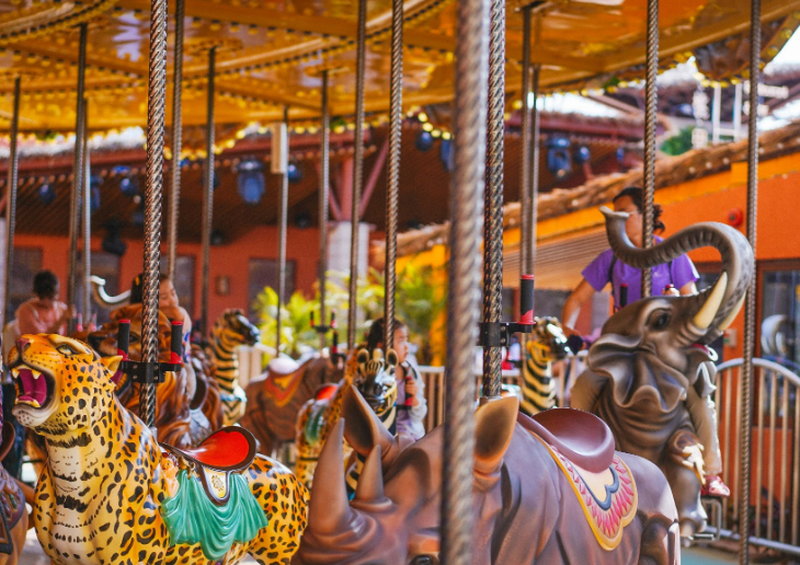 二、旋转木马旋转木马或回转木马游乐场机动游戏的一种,即旋转大平台上有装饰成木马且上下移动的座位供游客乘坐。最早记录的旋转木马出现于拜占庭帝国时期。约1860年欧洲出现第一个以蒸汽推动的旋转木马。如今在各大小游戏场、商场等地方皆有各式旋转木马。同名的有歌曲和电视剧。