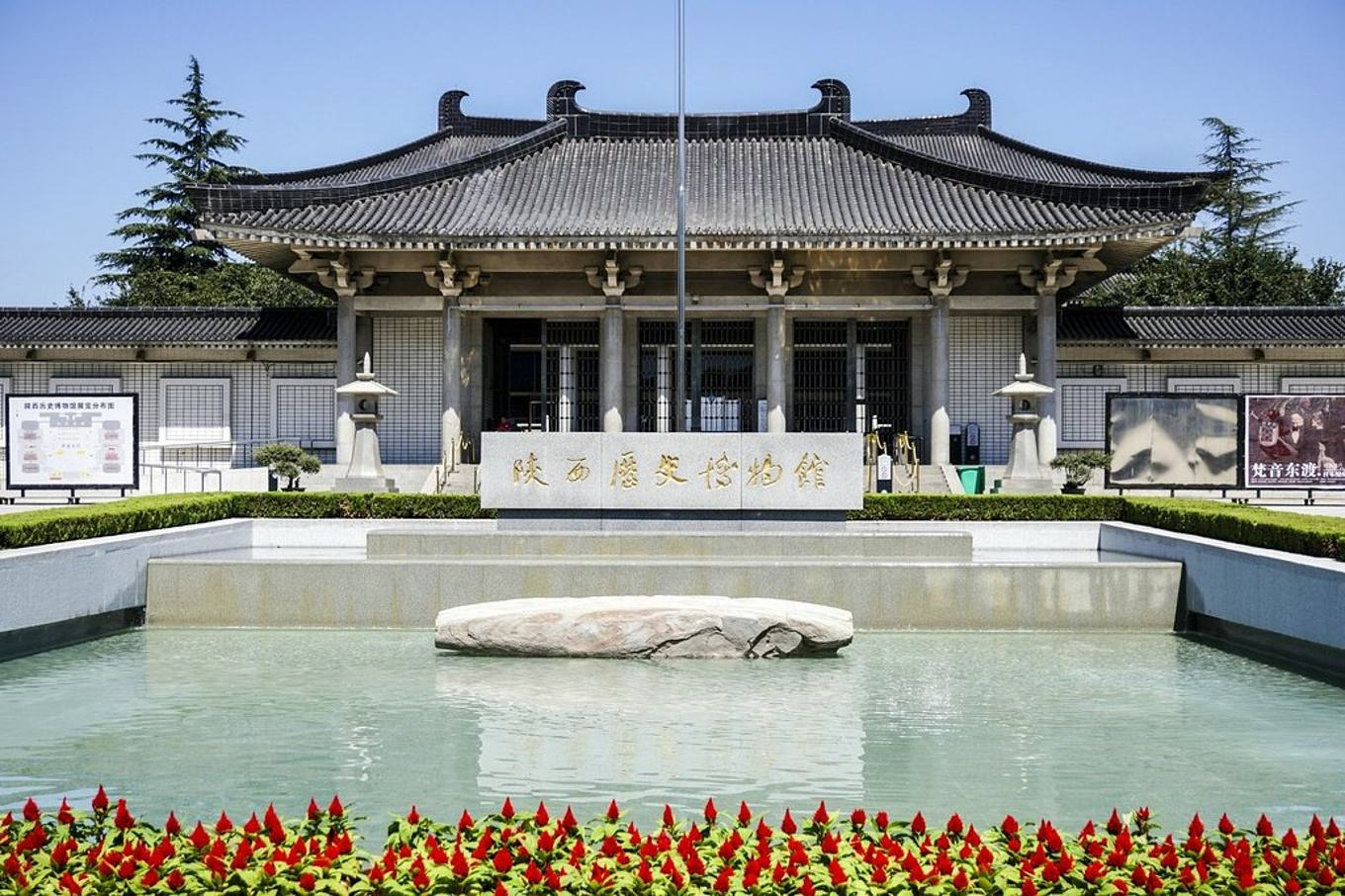 陕西历史博物馆位于西安大雁塔的西北侧,筹建于1983年,1991年6月20日落成开放,是中国第一座大型现代化国家级博物馆,前身可以追溯到1909年成立的陕西“劝工陈列所”,它的建成标志着中国博物馆事业迈入了新的发展里程。这座馆舍为“中央殿堂、四隅崇楼”的唐风建筑群,主次井然有序,高低错落有致,气势雄浑庄重,融民族传统、地方特色和时代精神于一体。馆区占地 65000平方米。上起远古人类初始阶段使用的简单石器,下至1840年前社会生活中的各类器物,时间跨度长达一百多万年。文物不仅数量多、种类全,而且品位高、价值广,其中的商周青铜器精美绝伦,历代陶俑千姿百态,汉唐金银器独步全国,唐墓壁 画举世无双。