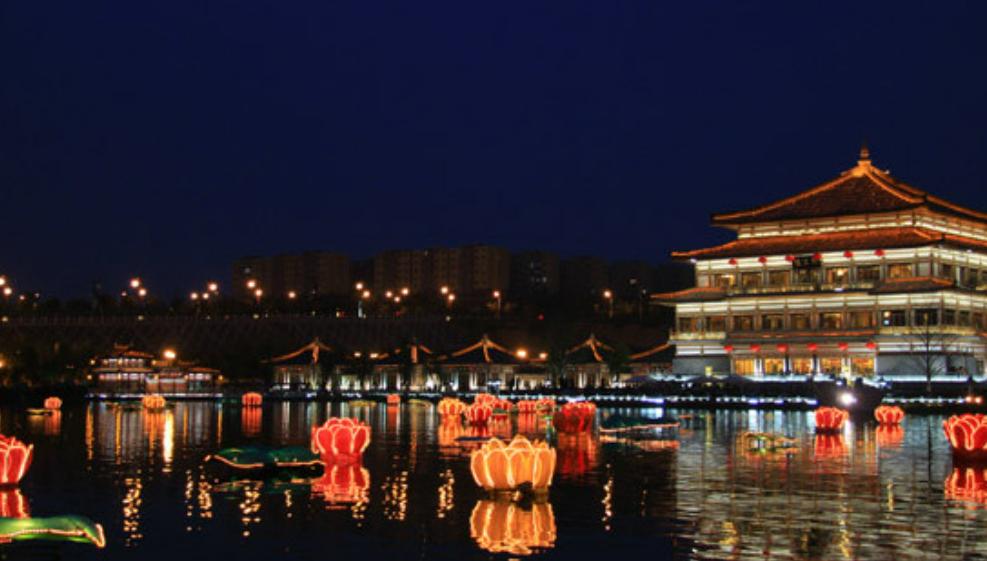 位于大雁塔东南侧的大唐芙蓉园,建于原唐代皇家芙蓉园遗址上。来到这里,可以观赏恢弘的仿唐建筑,欣赏灯光衬托下的美景,还可以观看具有盛唐风情的歌舞《梦回大唐》。