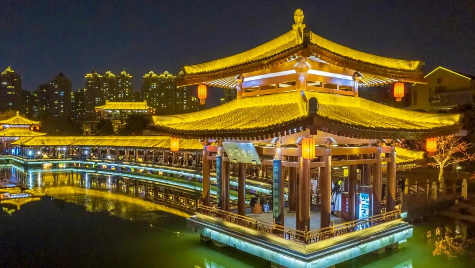 园中的夜景,也是极具璀璨色彩。每当夜幕降临,华灯初上时,游历于灯火辉煌中的唐文化长廊、芳林苑、紫云楼等地,处处灿烂夺目,在月色和灯光的映衬下,大唐芙蓉园更显高雅之美。