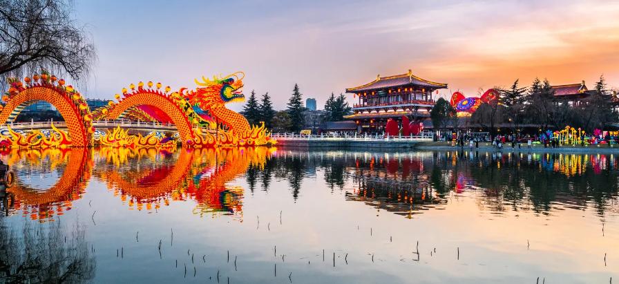 大唐芙蓉园是中国第一个全方位展示盛唐风貌的大型皇家园林式文化主题公园,国家5A级旅游景区,位于西安市城南的曲江开发区,于2004年建成。西安大唐芙蓉园内有紫云楼、御宴宫、唐市等仿古建筑,还有全球最大户外香化工程和全球最大的水幕电影表演,晚上的芙蓉园华灯齐上,更显繁华。