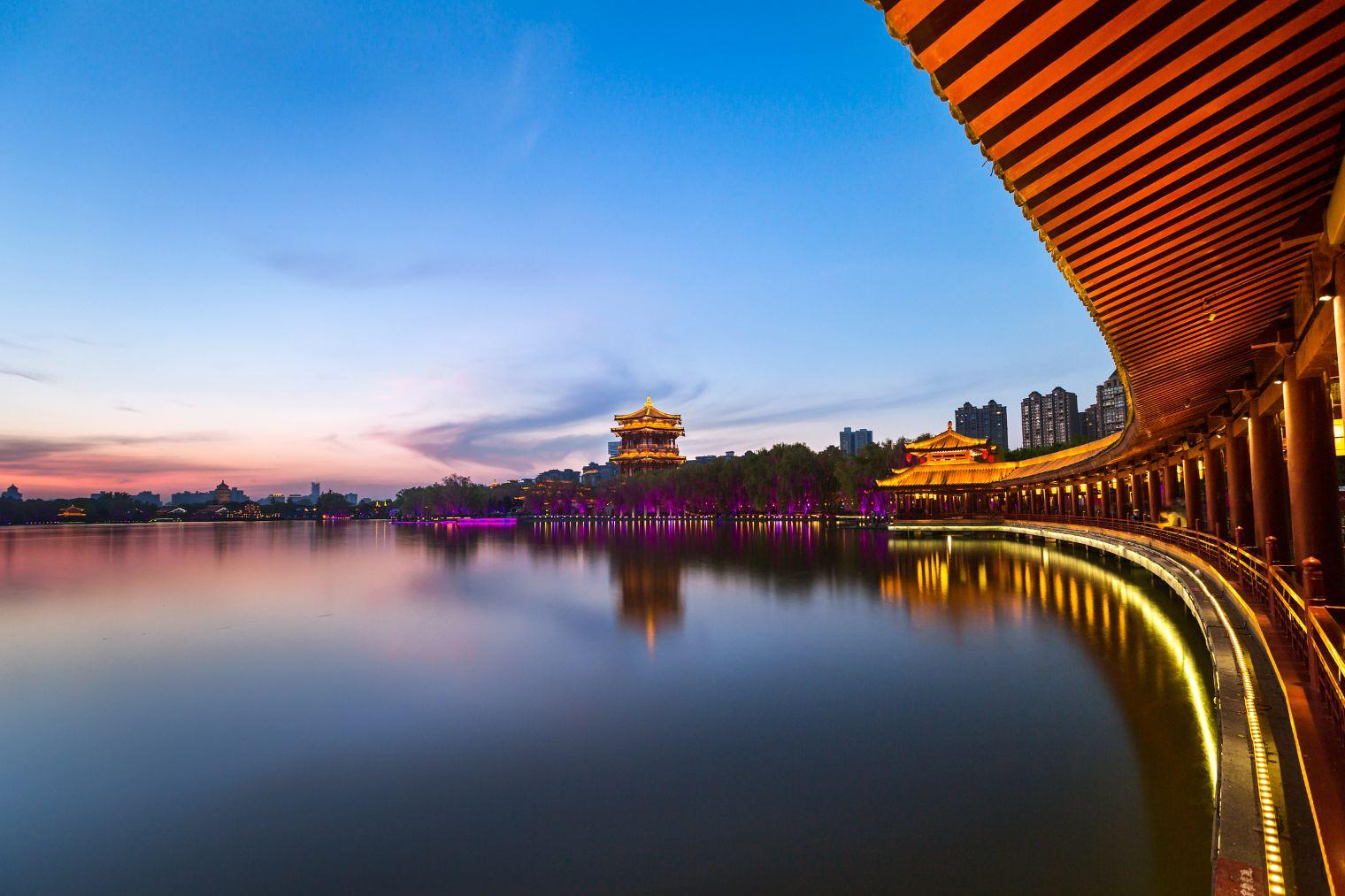位于大雁塔东南侧的大唐芙蓉园,建于原唐代皇家芙蓉园遗址上。来到这里,可以观赏恢弘的仿唐建筑,欣赏灯光衬托下的美景,还可以观看具有盛唐风情的歌舞《梦回大唐》。