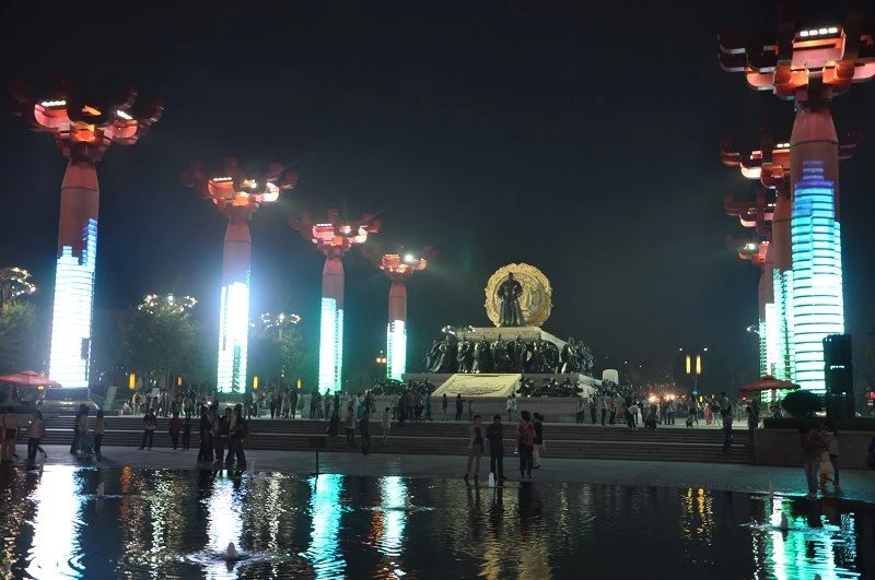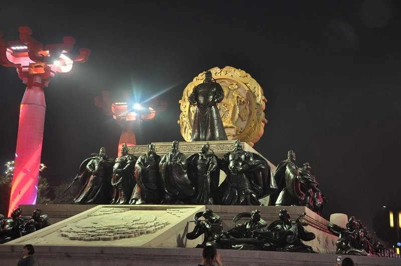 大唐不夜城的中轴景观大道是一条约1500米横贯南北的中央雕塑景观步行街,其上分布着盛世帝王、历史人物、英雄故事等九组主题群雕,立体展现大唐帝国在宗教、文学、艺术、科技等领域的地位并彰显大国气象。