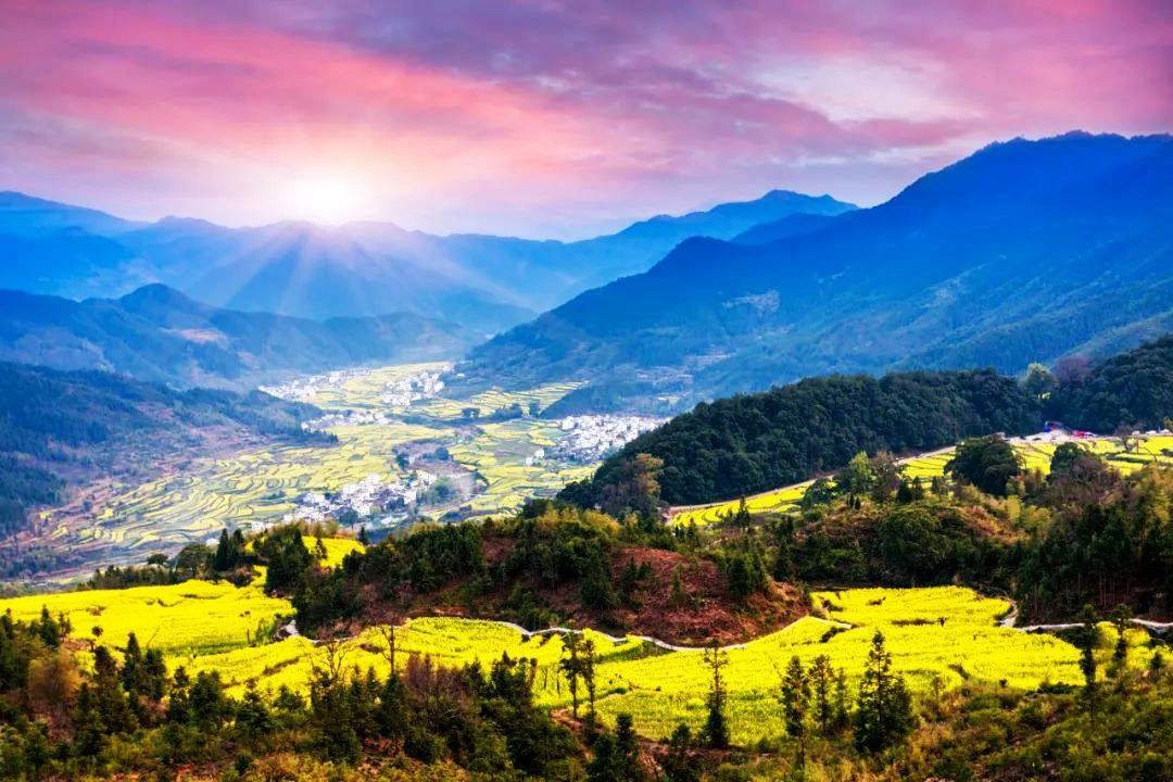 江岭景区坐落于婺源县东北部,总面积38平方公里。众所周知,油菜花是婺源最著名的景观,而江岭油菜花最为出名,又中国四大花海的美誉。作为婺源必去的三个景点之一,每年3月初到4月上旬,站在山顶望去,脚下的油菜花呈梯田状,从山顶铺散到山谷下。层层叠叠,一望无际。在万亩梯田中间,零零散散的分布着几个村落,黑瓦白墙的徽派民居夹杂在一片金黄之中,构成一幅天人合一的画卷,吸引了不少摄影爱好者前来采风。