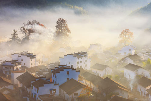 石城有两个村庄:程村与戴村,被青石板古驿道贯穿整个村庄的叫戴村,而那粉墙黛瓦的古民居在烟雾中若隐若现的是程村。两村之间隔着一个小山坡,村后都有古枫点缀,但又各具特色。石城程村三面都有古枫树环抱,一面是石灰岩小山坡,早晨的晨雾悬挂在树半腰,加上村庄中的炊烟,如梦如幻,很受摄影爱好者的青睐。石城戴村有条古道可以通往长溪村,徒步13公里左右。