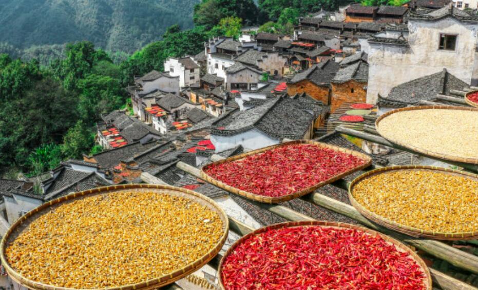 秋天的“晒秋”,即,每年春夏交替,房前屋后成晒竹匾的世界,长长的木架托起圆圆的晒匾,晒着各色的作物,在白墙灰瓦、青山绿林中,美成了一幅画。