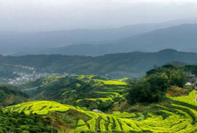 江岭地处婺源县东北,南临晓起,东接溪头。这里的油菜花田不是平地上的,而是沿着山坡一层一层的梯田,到了3、4月份油菜花开,站在山顶的观景台上,可以俯瞰到婺源田园风光优美的一面,一般说的婺源油菜花就是在这里。