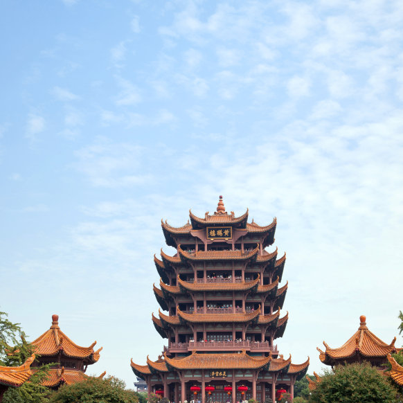 黄鹤楼位于湖北省武汉市长江南岸的武昌蛇山峰岭之上,为国家5A级旅游景区,享有“天下江山第一楼”、“天下绝景”之称。黄鹤楼是武汉市标志性建筑,与晴川阁、古琴台并称武汉三大名胜。黄鹤楼始建于三国时代吴黄武二年(公元223年)。唐代著名诗人崔颢在此题下《黄鹤楼》一诗,使它闻名遐迩。
