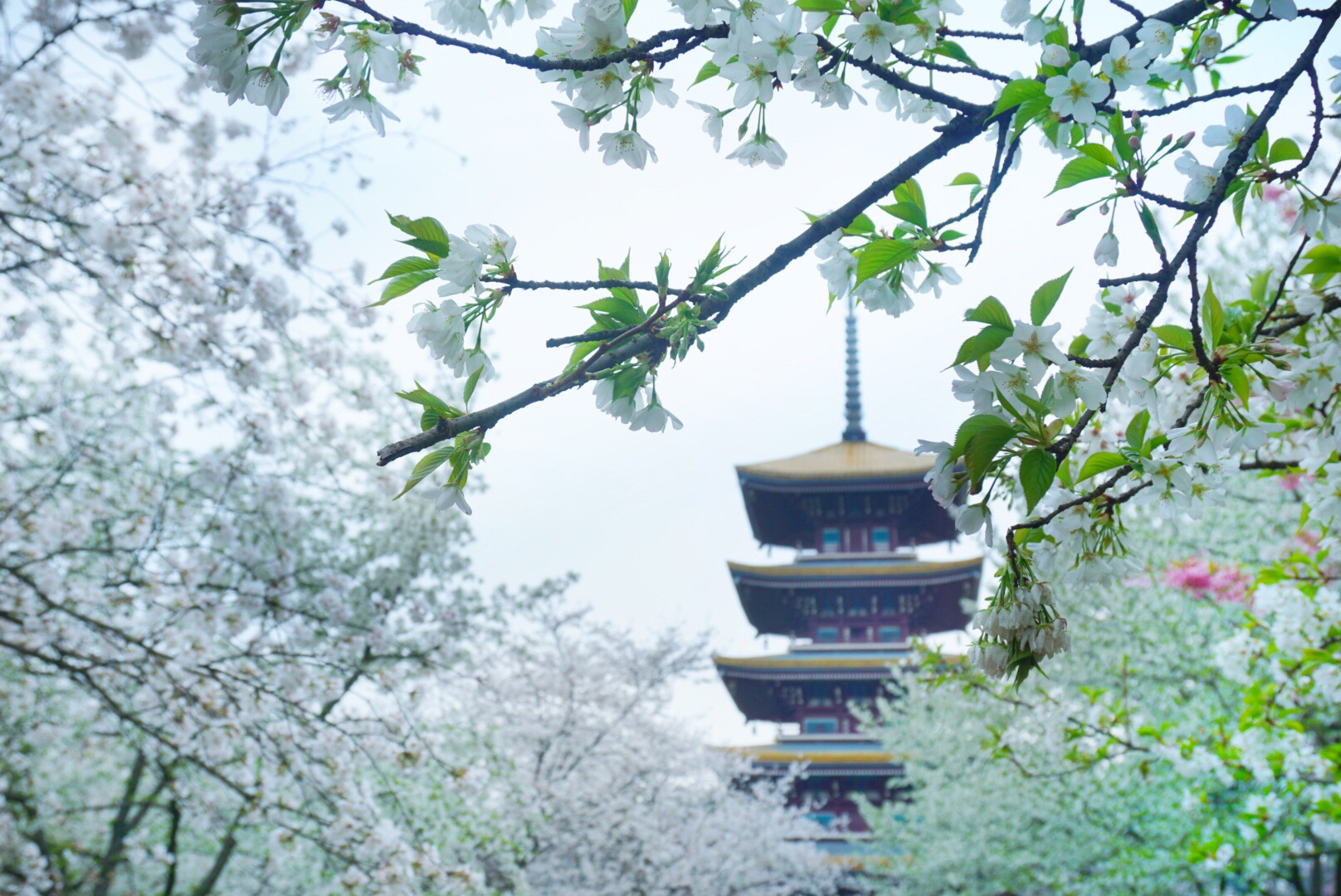 走进武汉东湖磨山樱花园,依着青青的山坡,几千株樱花烂漫的盛开着,雪白一片。微风吹来,花枝摇曳,落英缤纷。木塔水影,波泛幽香,徐徐春风中,让人流连忘返。