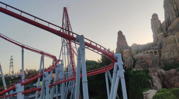 极速世界是速度刺激的力量体验区,位于公园入口区的右侧与魔幻城堡区相呼应;在规划上以极速飞车(弹射过山车)围合出娱乐广场空间。