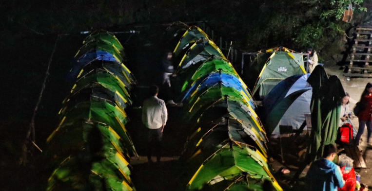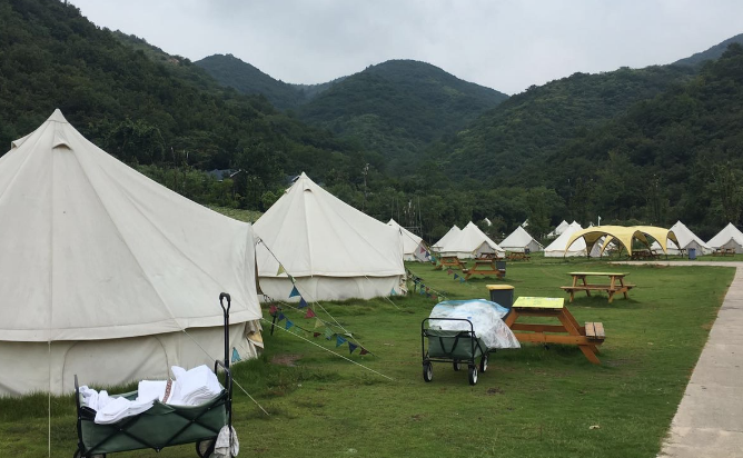 黄陂云雾山露营地的帐篷可供游客选择,帐篷靠湖边位置,一共三排;这里的帐篷大床有双床和云阁房型,其中的云阁房带单独院子。