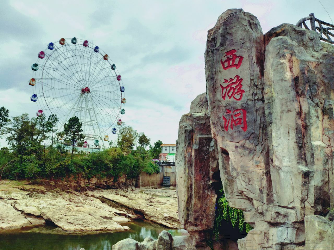 占地300多亩的河东生态观光区以自然生态观光为主,特色游乐项目为辅,生态观光区建设有民俗风情街,湖心岛,休闲长廊,古镇演艺中心,双龙戏水,竹园等,同时建设有铁索挑战桥,高空滑索,水上摩天轮、水上画舫及水上自行车等特色游乐项目。