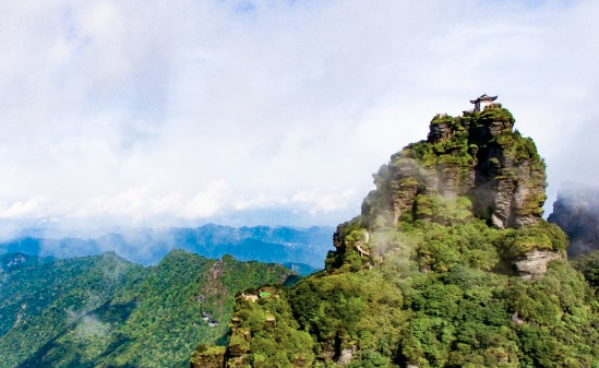 红云金顶位于铜仁梵净山生态旅游区。武陵山脉最高峰,红云金顶拔地而起,垂直高差达百米。上半部分一分为二,由天桥连接,两边各建一庙,一边供奉释迦佛,一边供奉弥勒佛。由此印证现代佛(释迦牟尼)向未来佛(弥勒佛)的交替。晨间红云瑞气常饶四周,人称红云金顶。