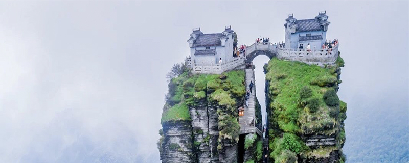 新金顶上半部分被“金刀峡”隔成两座孤峰——南面建有释迦殿,供奉释迦佛;北面建有弥勒殿,供奉弥勒佛。中间由天桥连接,状若飞龙。红云金顶从不同角度观看,分别似佛手二指禅,也像生命的图腾,因此又被称为“天下第一峰”。