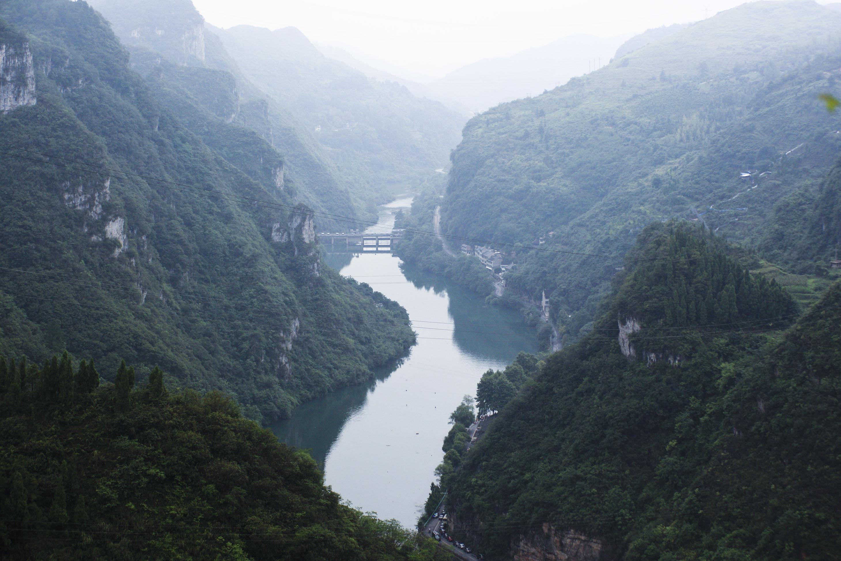 登阁远眺花溪河水如带,近望云海苍茫,早看八面山晨曦,夜观花柳万家灯火,左侧有名山飞仙阁,原有一条银色瀑流,从150米高的悬岩上飞泻而下,气势磅礴。如今飞水被截流发电,只剩下余波细流,若遇大雨滂沱,飞瀑依然如旧。