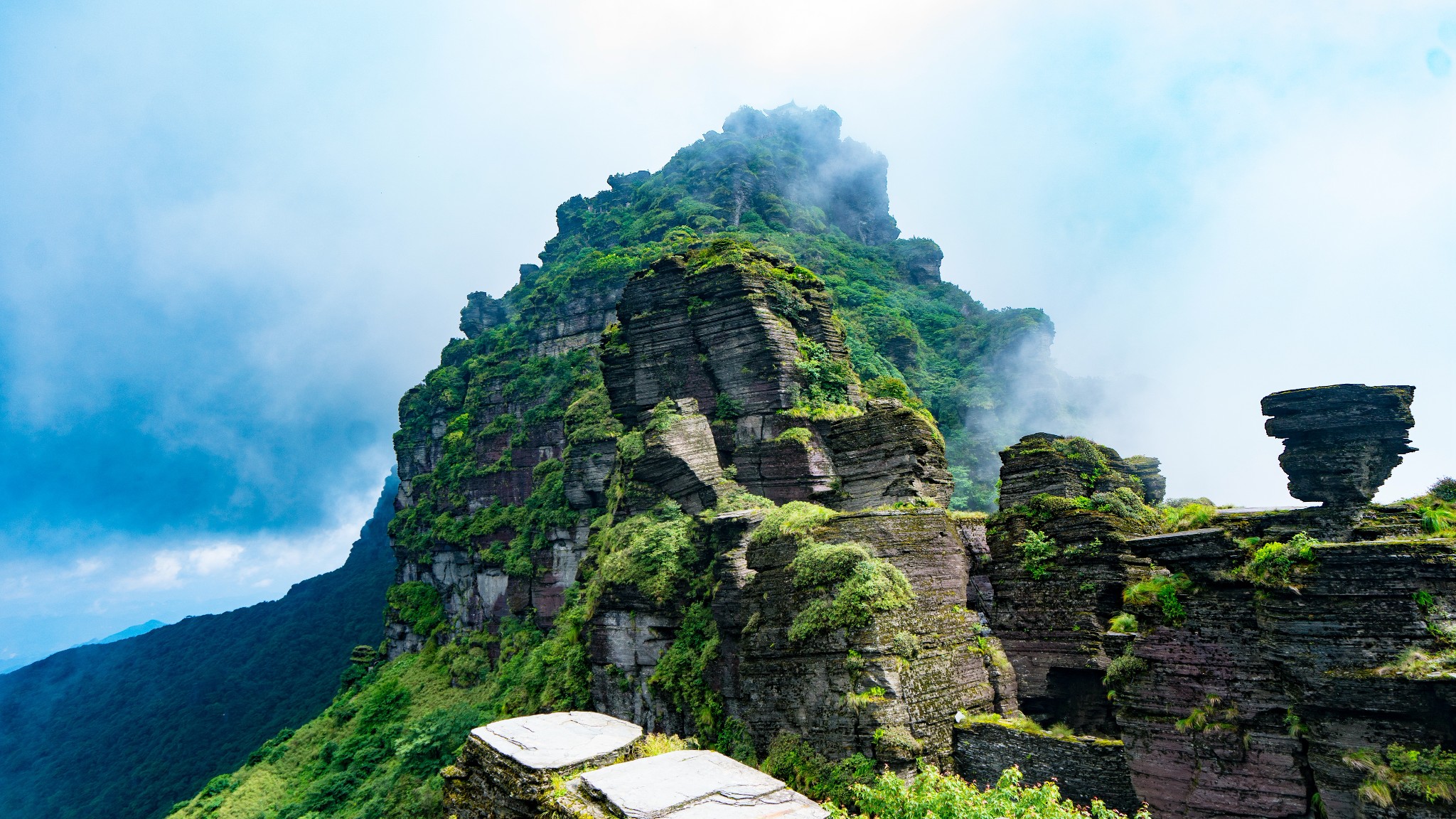 老鹰岩位于铜仁梵净山生态旅游区面向蘑菇石的右上方,前往老金顶的途中。梵净山顶一块似鹰嘴的岩石,这是一方耸立在山巅的巨石,其形状像一只神情严视,展翅欲飞的天鹰,屹立于山巅,老鹰岩是地壳运动后的地质遗产,观赏价值极高。