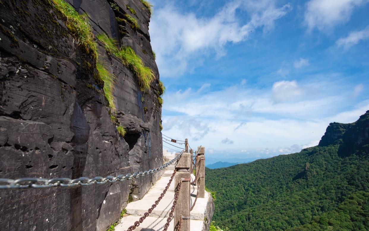 红云金顶位于铜仁梵净山生态旅游区。武陵山脉最高峰,红云金顶拔地而起,垂直高差达百米。上半部分一分为二,由天桥连接,两边各建一庙,一边供奉释迦佛,一边供奉弥勒佛。由此印证现代佛(释迦牟尼)向未来佛(弥勒佛)的交替。晨间红云瑞气常饶四周,人称红云金顶。