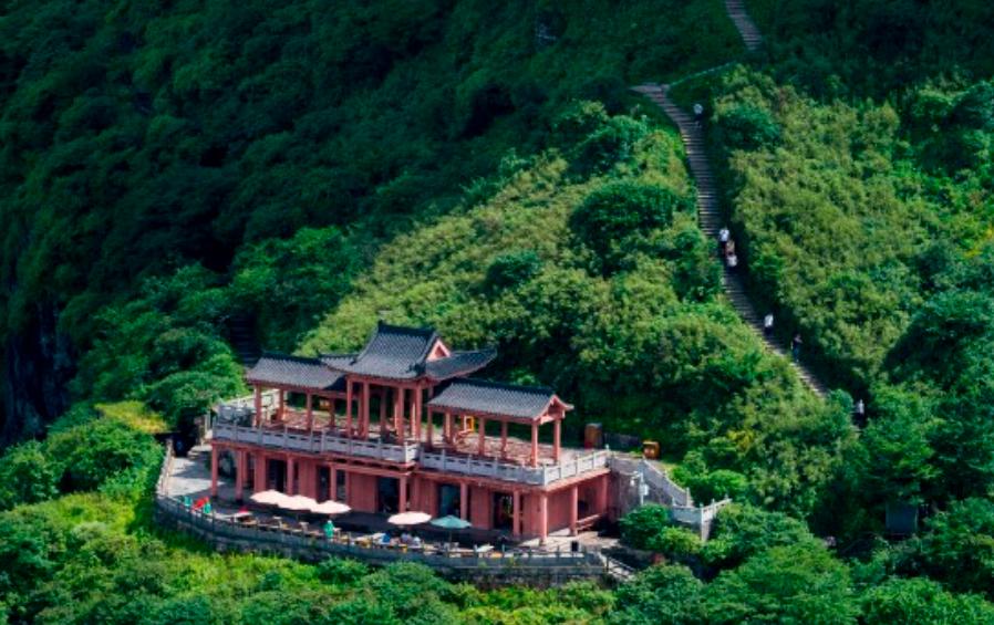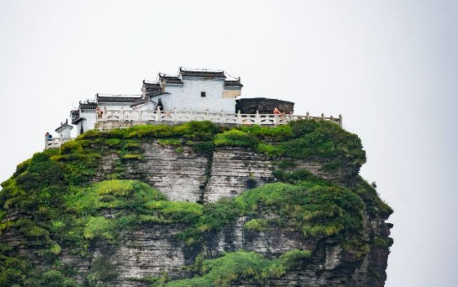 位于铜仁梵净山生态旅游区。武陵山脉最高峰,红云金顶拔地而起,垂直高差达百米。上半部分一分为二,由天桥连接,两边各建一庙,一边供奉释迦佛,一边供奉弥勒佛。由此印证现代佛(释迦牟尼)向未来佛(弥勒佛)的交替。晨间红云瑞气常饶四周,人称红云金顶。