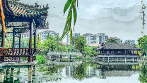公园内三桥两亭附近有个很大的荷花池,市民可以坐在荷花池旁的亭子里或站在小桥上欣赏荷花,十分惬意。地点:光荣道与红桥北大街交口