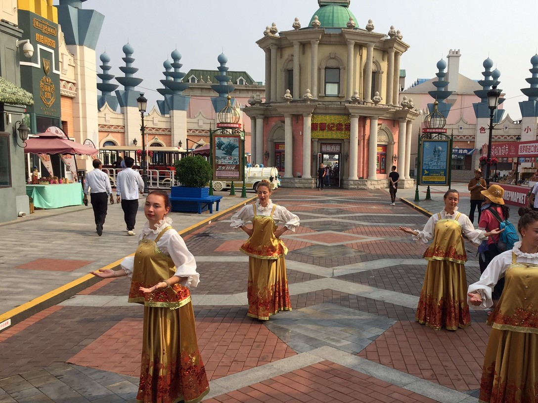 俄罗斯文化创意风情街,一条以俄罗斯文化为核心的综合型主题街区,街两旁有几家俄式西餐厅、咖啡馆,还有制作和售卖俄罗斯套娃等手工艺品的店铺,幸运的话便能看到套娃的制作过程。在街道的中央是园内的异域风情秀,有来自俄罗斯的各种街头表演,风情街的尽头处也是花车巡游的起点。