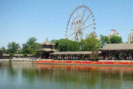 颇有承德避暑山庄神韵的“碧波庄”占地23.5亩,坐落于公园的东南部,该园临水而建,青砖灰瓦、亭台楼阁,呈北方庄园特色,显古朴厚重之风格,园内有镌刻着我市百名文人书写的100个寿字的“百寿影壁”。
