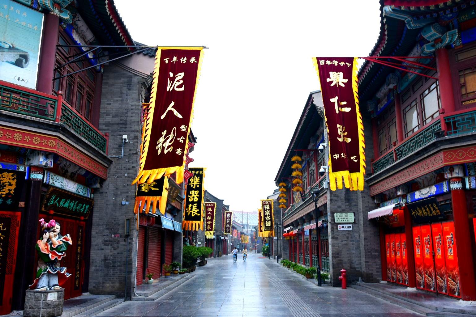 街边的店铺也是清式建筑为主,一律青墙红柱,高低错落的飞檐翼角,显得典雅、精致,还有装饰彩绘图案如历史、神话、人物、花鸟等的门窗看上去十分精美,夺人眼球,加之门口悬挂的宫灯,为这街道增添不少古朴的韵味。